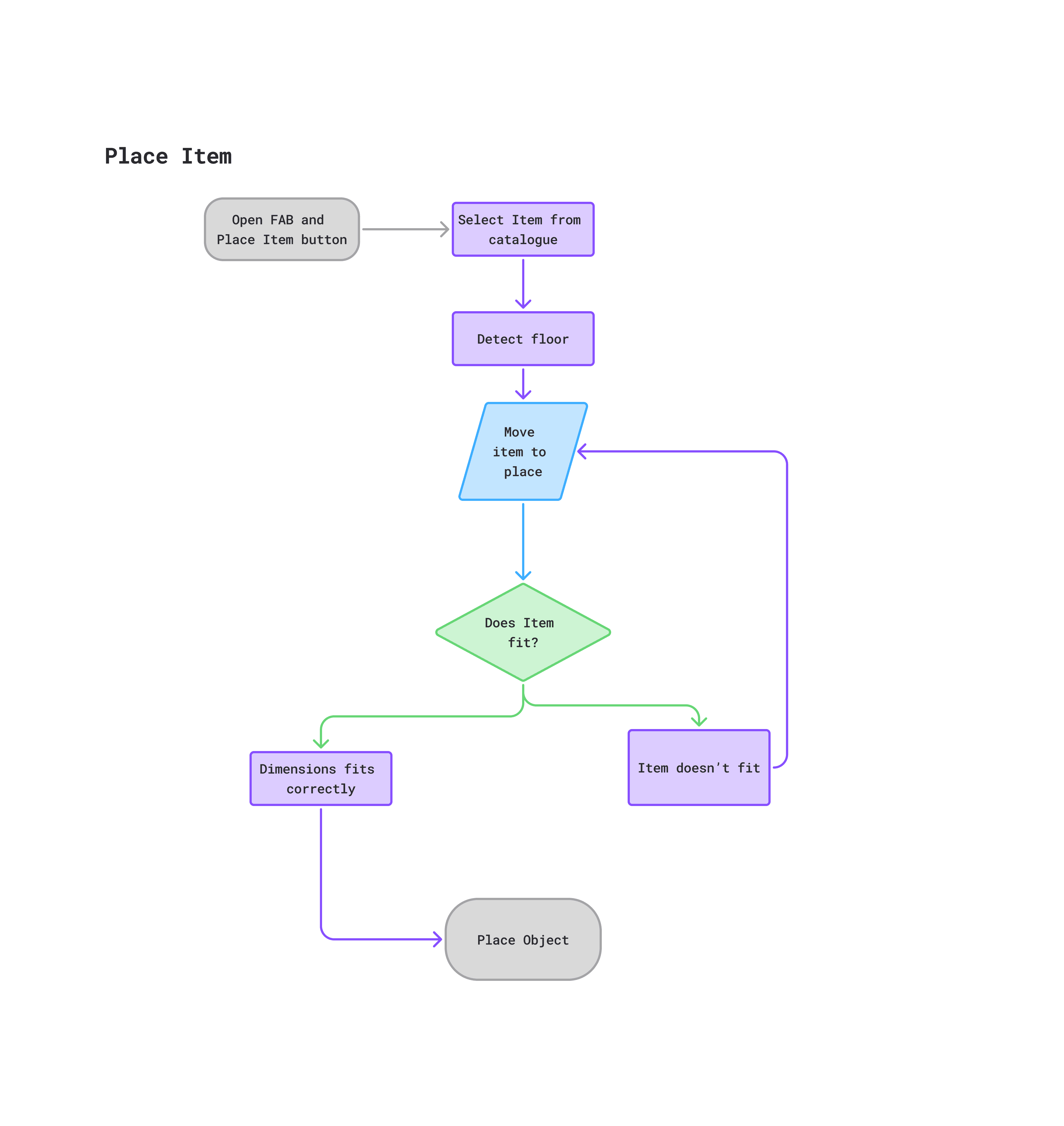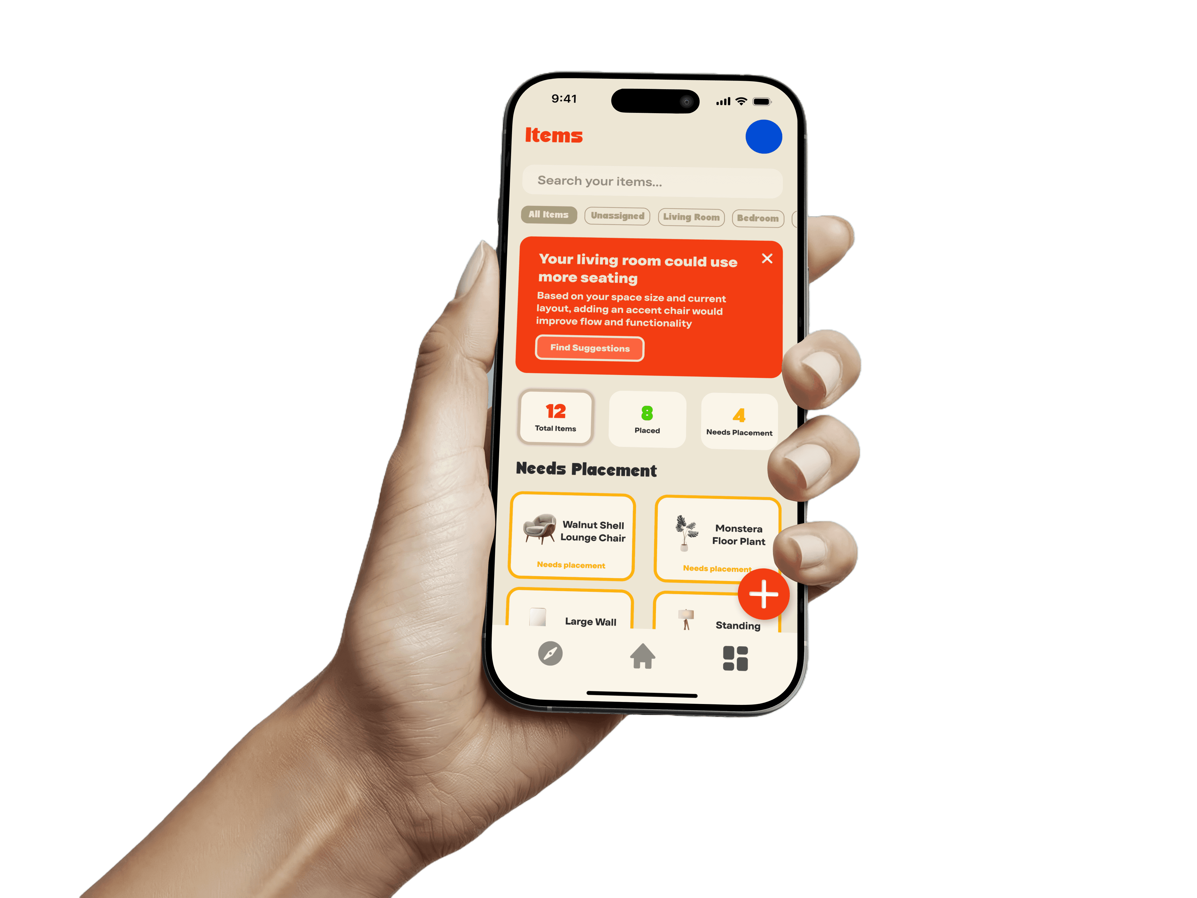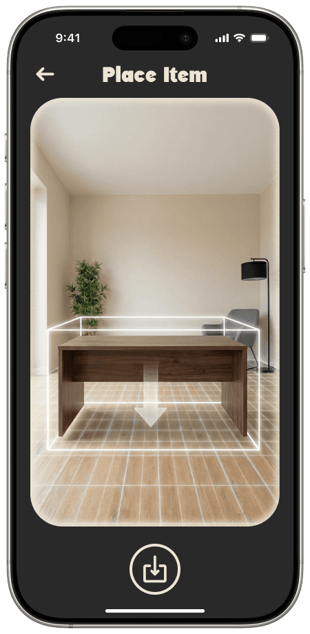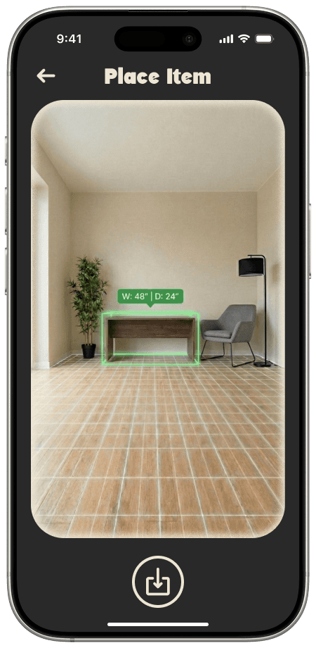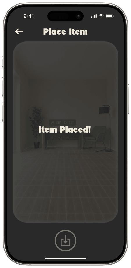 This page is where the users' furniture is all managed. Users can view their belongings categorised by status("placed" vs "needs placement"). By separating the logistical task of tracking items from the visual task of placing them, the app reduces decision fatigue. The 'Items' list handles the memory work, allowing the user to focus purely on how their space looks and feels.