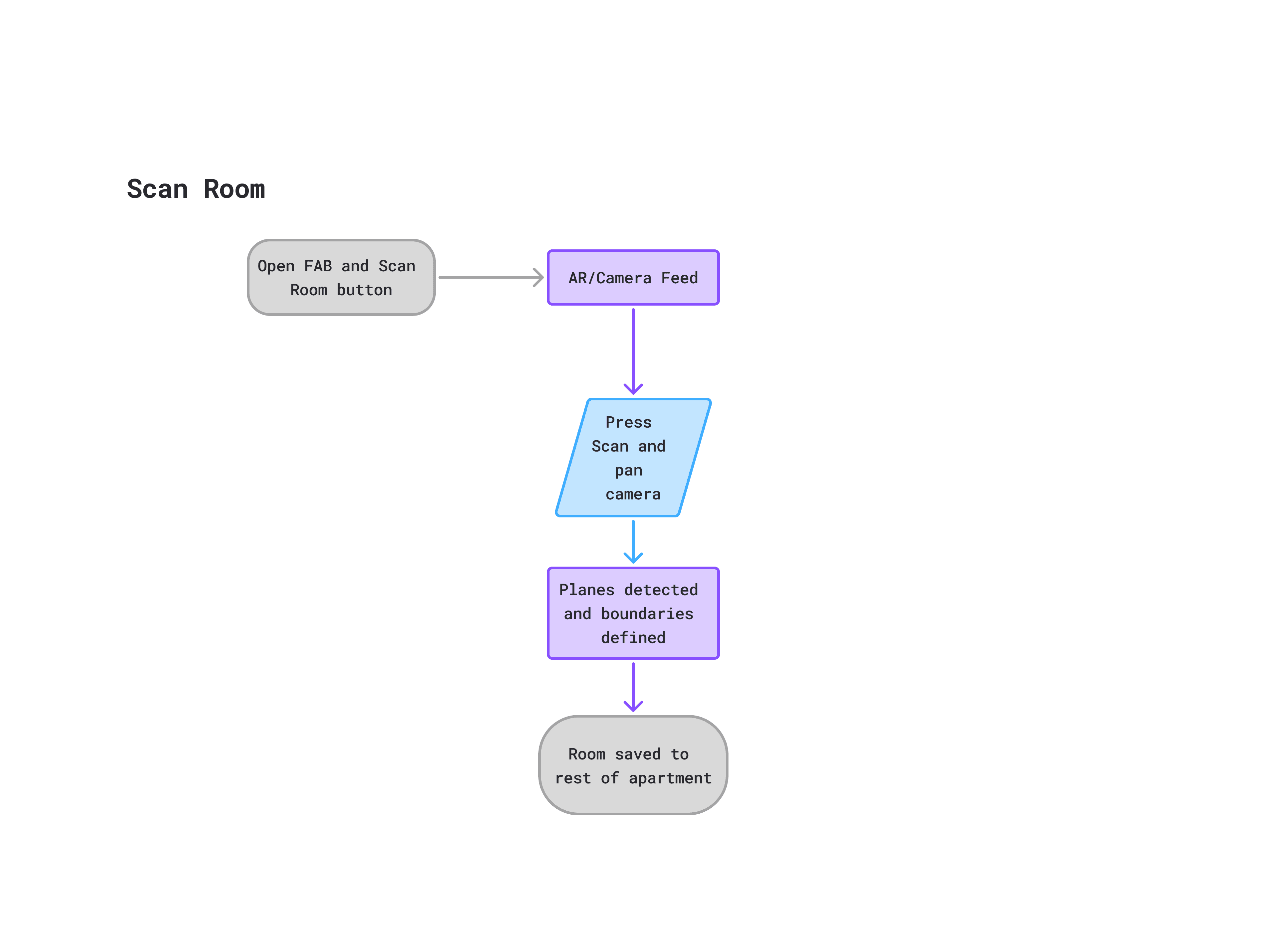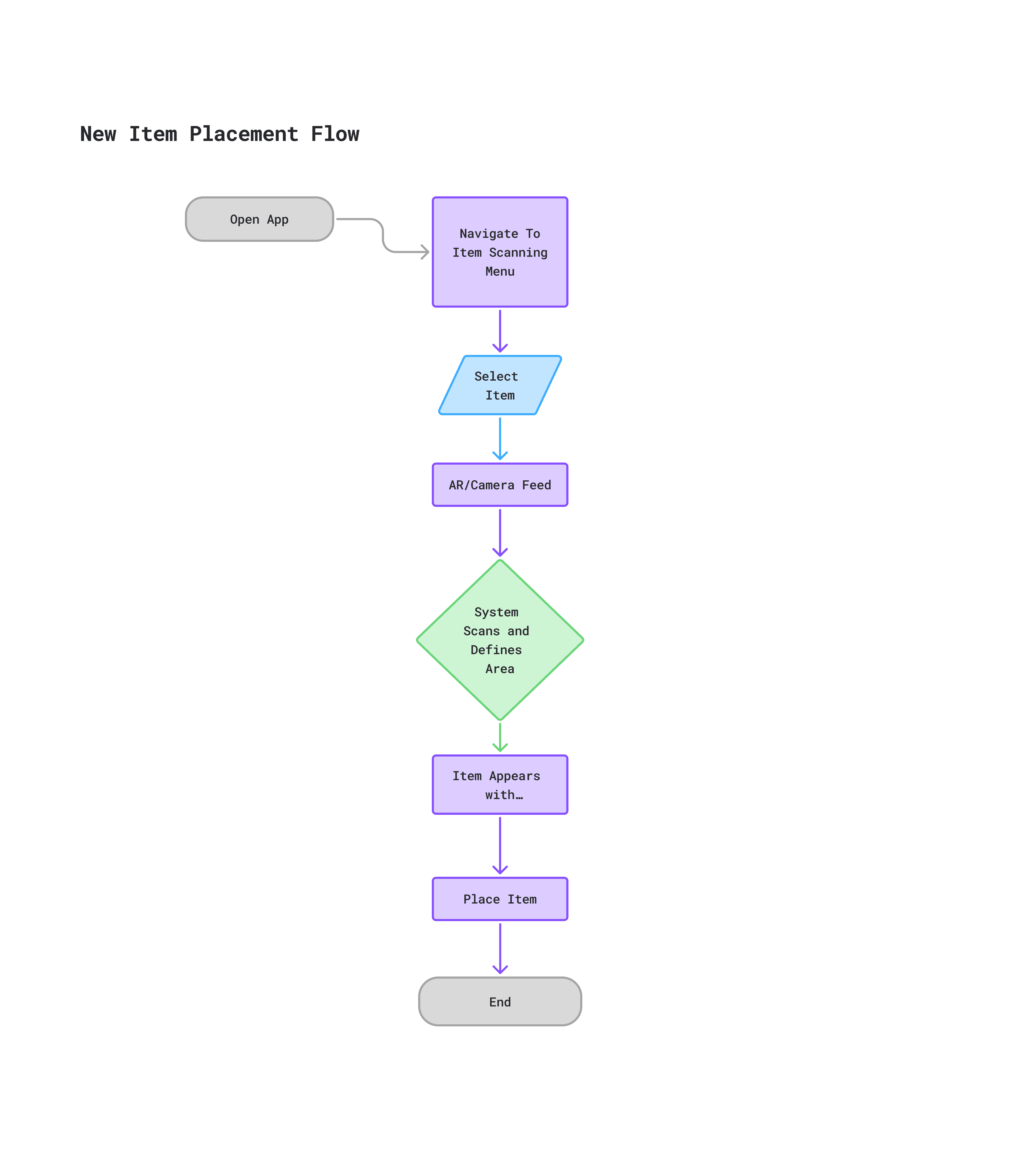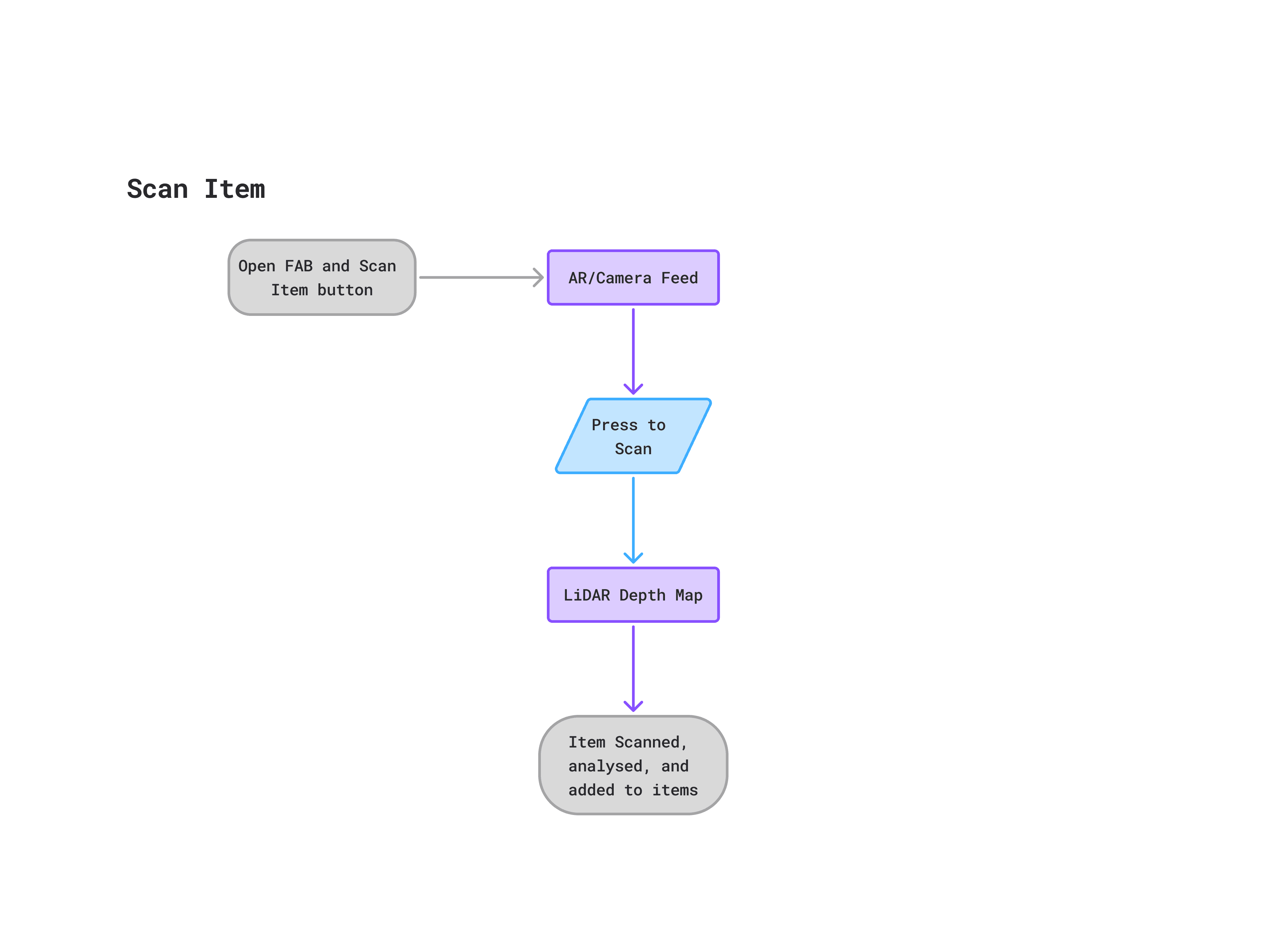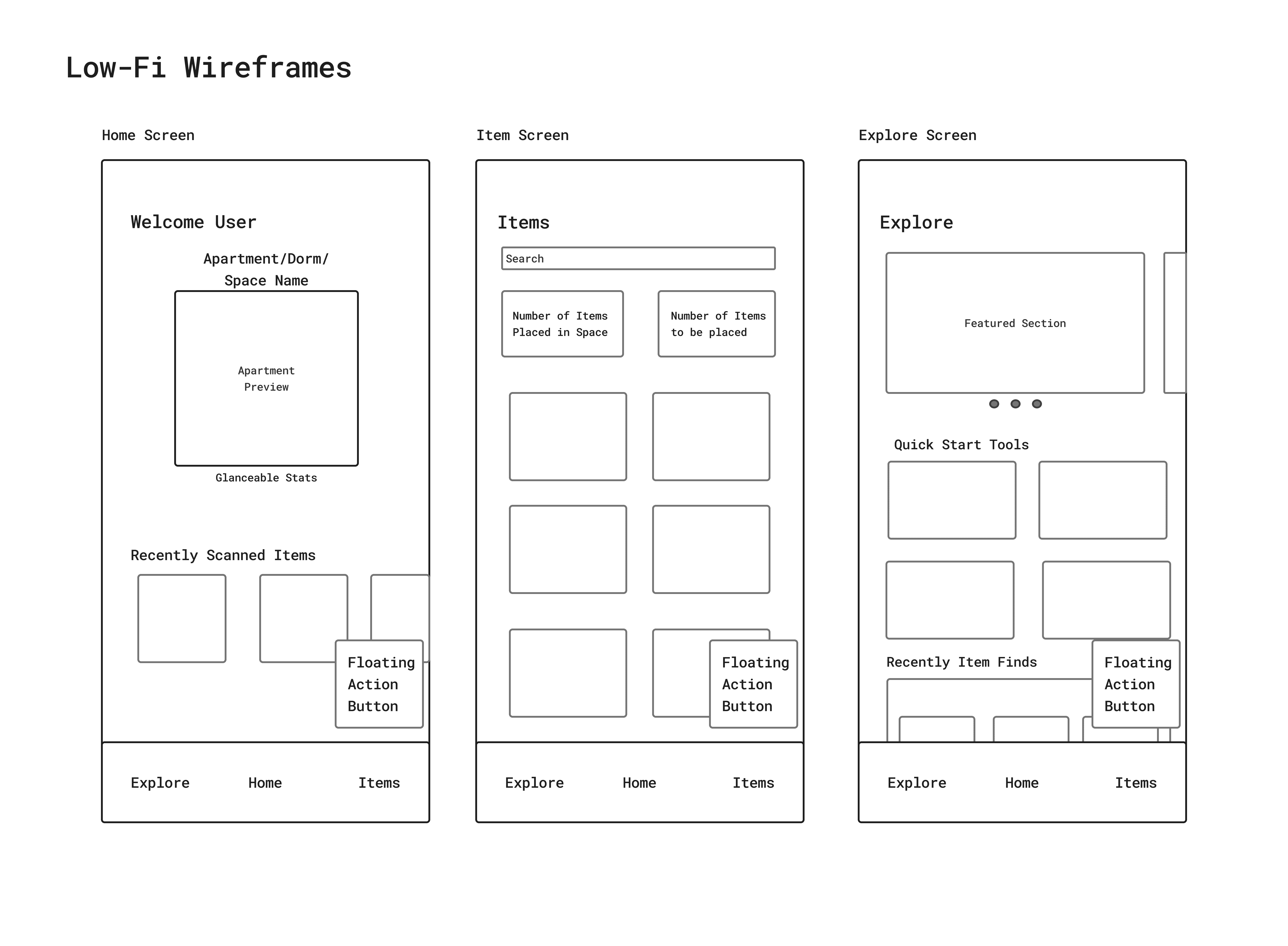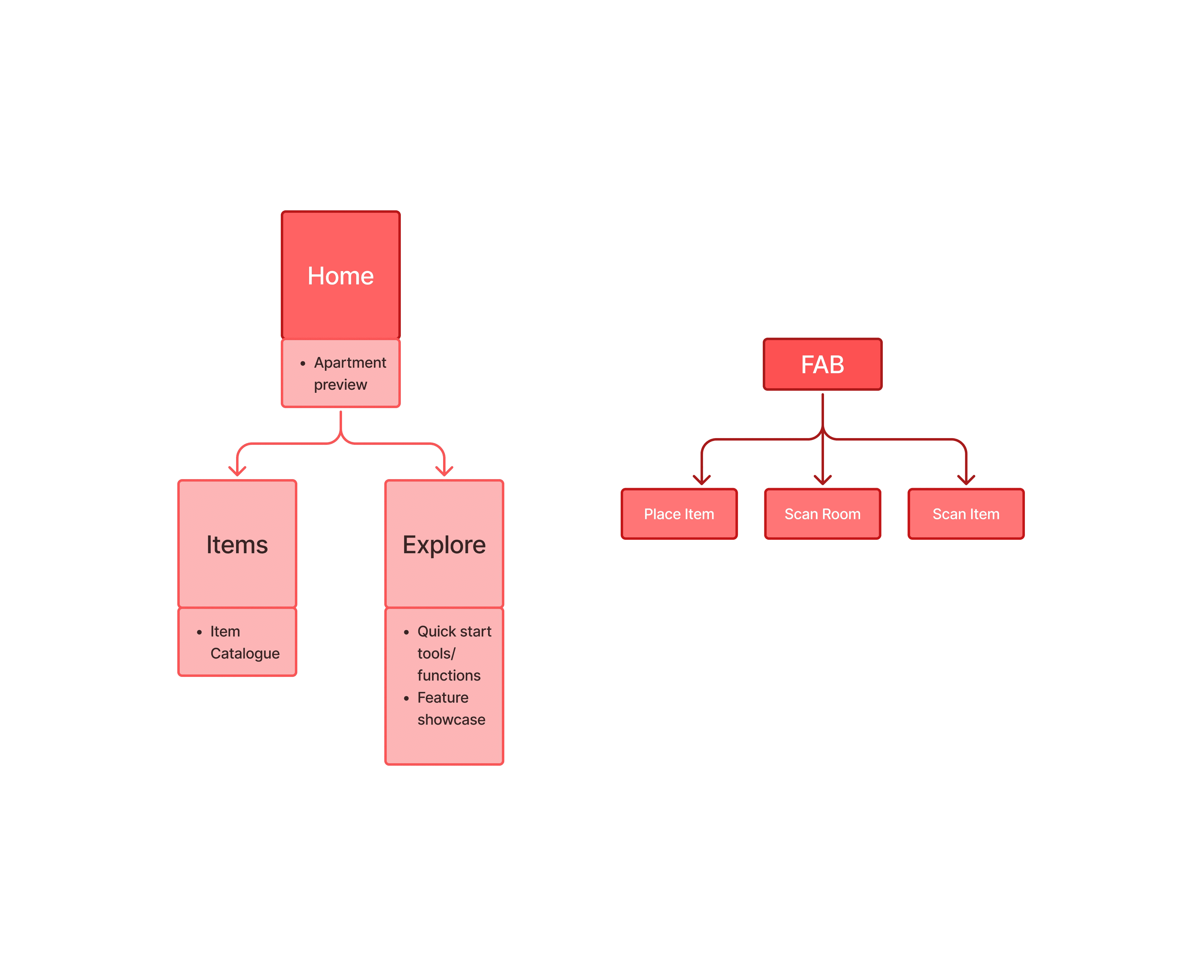In order to organise all the new ideas for the system and the restructuring of the app, I decided to create a basic site map. This allowed me to better understand how I should place things in relation to each other and guided me when producing my wireframes and eventual prototype. It also helped me to decide that I should use a floating-action-button to manage my core interactions of scanning items/rooms, and placing items.