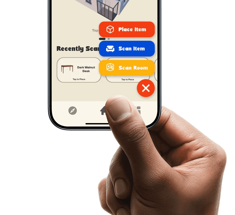 NTR-AR's Floating Action Button (FAB) serves as the gateway to the camera and the AR features. By grouping these high-friction core interactions (Place Item, Scan Item, Scan Room) into a single expandable menu, the main interface remains uncluttered while keeping core functionality accessible in the natural zone occupied by your thumb.